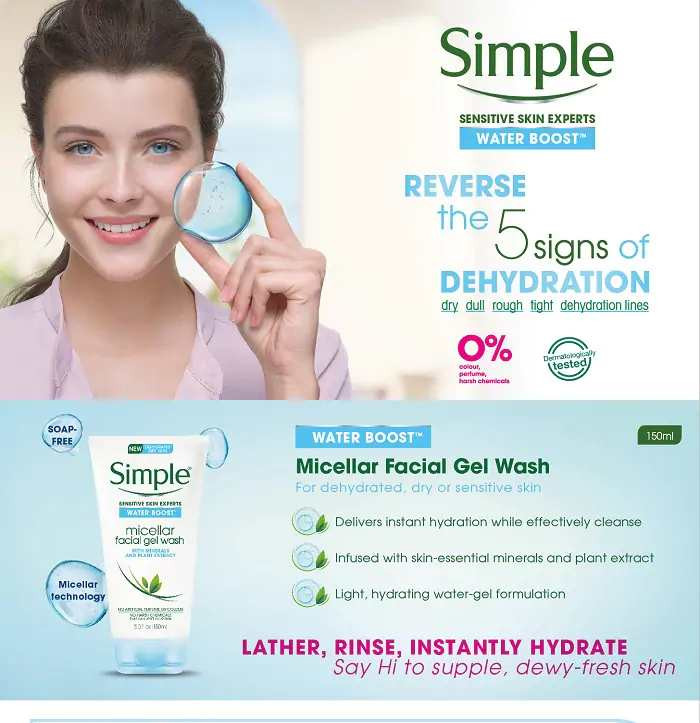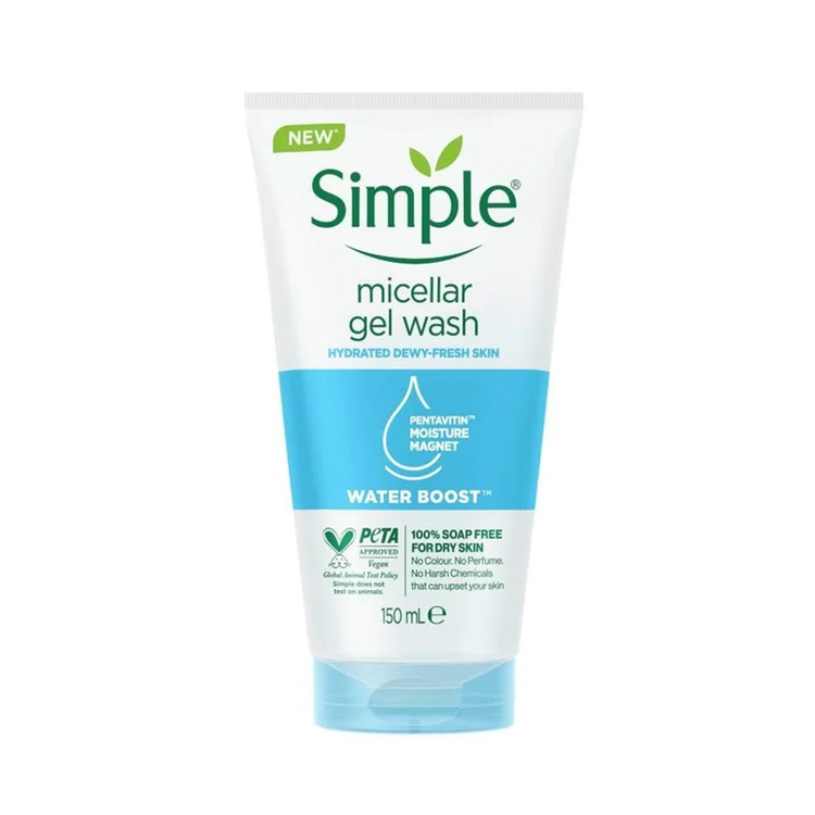 ژل شوینده صورت میسلار سیمپل Simple Water Boost Micellar دارای فرمول ویژه جهت پاک کردن روزانه آلودگی های پوست و آرایش و گریم به همراه رطوبت رسانی مضاعف جهت جلوگیری از احساس خشکی پوست های دهیدراته، خشک و حساس می باشد. شوینده صورت سیمپل حاوی ملکول های میسل جهت جذب ملایم آلودگی و ناخالصی های پوست است، این ترکیب با 4 درصد مواد فعال رطوبت رسان از جمله ماده موثره گیاهی پنتاویتین Pentavitin همراه شده است که مانند آهنربا رطوبت را به لایه های پوست جذب و متصل می کند. نتیجه احساس پوستی شاداب و بدون احساس تنگی و کشیدگی پس از شستشوی صورت است. شوینده صورت سیمپل فاقد الکل، صابون، چربی، رنگ و رایحه است و برای پوست های حساس گزینه بسیار مناسبی محسوب می شود.