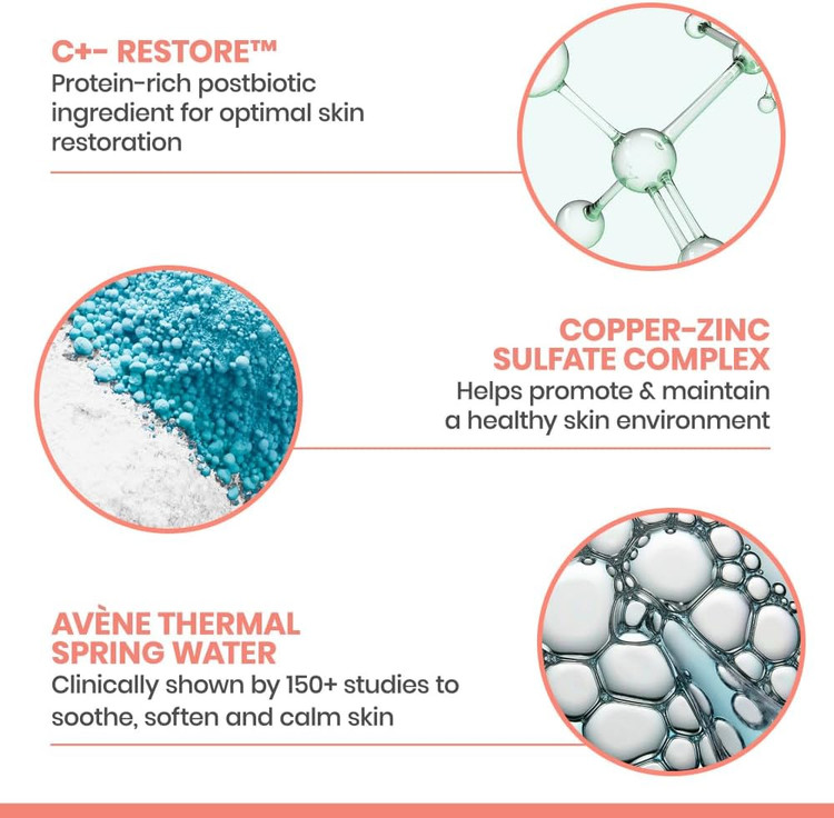 - دارای C + Restore ماده نوآورانه و ترمیم کننده پست بیوتیک، جهت تامین پروتئین لازم برای ترمیم و بازسازی پوست