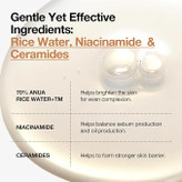 خاصیت ضدالتهابی و تسکیندهنده: عصاره برنج و سرامیدها دارای خواص ضدالتهابی هستند که میتوانند به تسکین پوست و کاهش قرمزی و التهابات کمک کنند. این ویژگیها باعث میشود پوست آرام و بدون تحریک باشد و در برابر عوامل محیطی مقاومتر عمل کند.